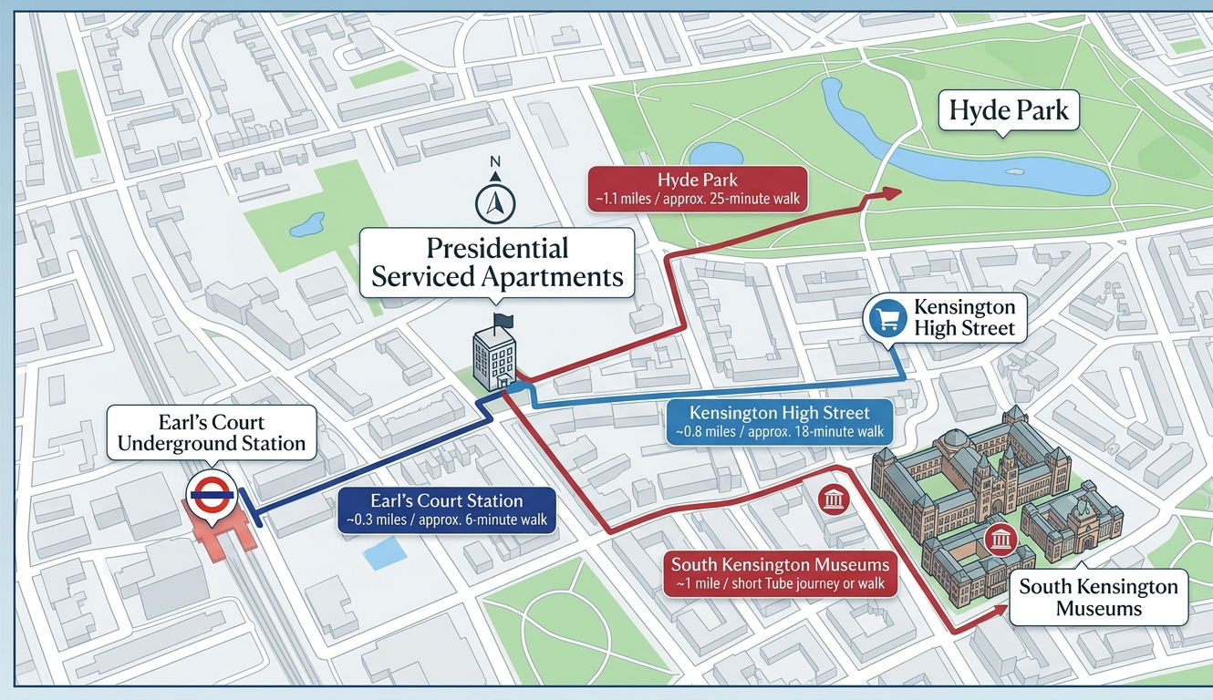 Presidential Apartments is located in Kensington, within walking distance of Earlâs Court Underground Station and close to major attractions, parks, and shopping.